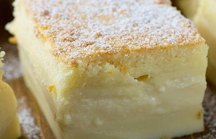 6. Despeje em uma forma untada e enfarinhada e leve ao forno por uns 50 minutos, ou até que a camada de cima esteja firme e levemente dourada.