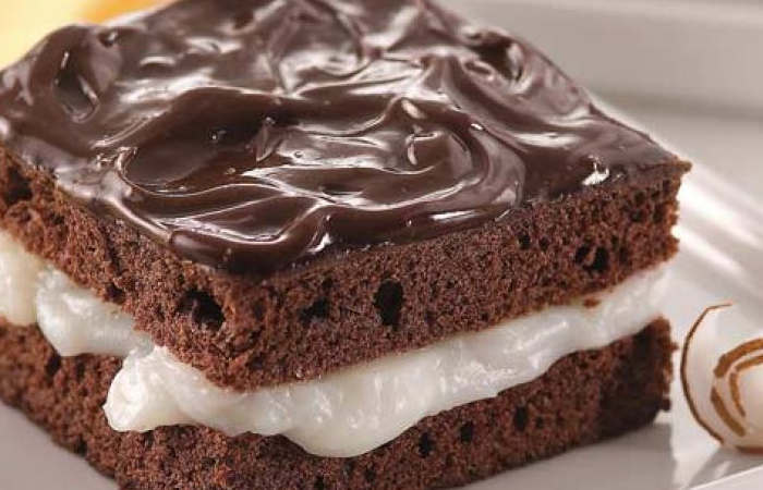5. Para o recheio, dissolva a mistura para pudim sabor coco em 1 xícara de leite, leve ao fogo e mexa até formar um creme. Deixe esfriar e espalhe sobre uma das parte do bolo.