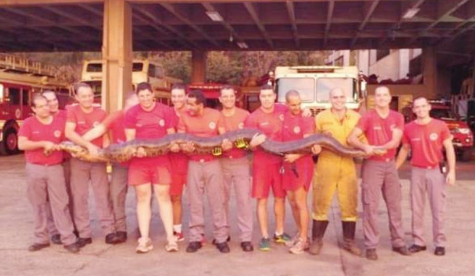 Avisados por moradores que ficaram assustados com o tamanho do réptil, os bombeiros “resgataram”. A cobra foi capturada e colocada em uma gaiola para ser transportada.
