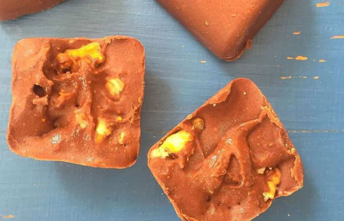 2. Depois, coloque a massa em uma forma de gelo. Em seguida, acrescente as castanhas (amêndoas e o pistache) por cima.