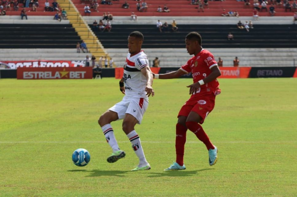Aos 19 minutos, Caio Dantas, ele mesmo, acertou uma linda bicicleta e exigiu que Victor Souza evitasse o golaço no Santa Cruz.