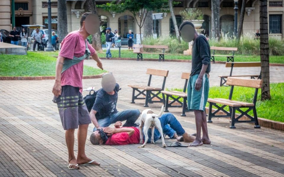 A briga começou em um imóvel abandonado, na esquina da Rua Duque de Caxias com a Rua Tibiriçá, onde vivem algumas pessoas. Um homem de aproximadamente 35 anos deu uma paulada no rosto de um outro homem, de 50 anos.