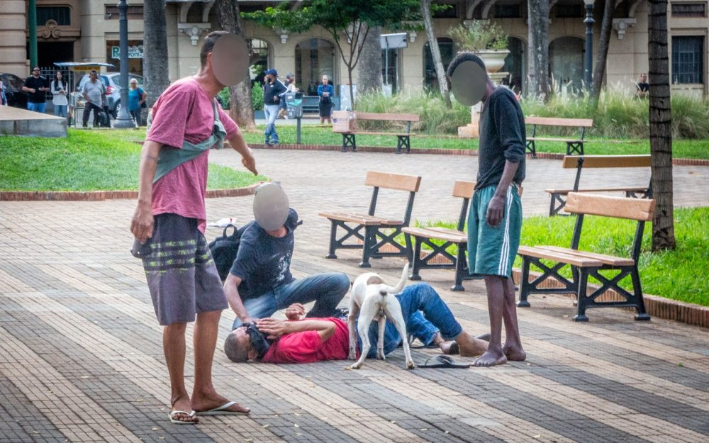 A discussão seguiu na direção da Praça XV de Novembro, onde um outro morador em situação de rua, inconformado, arrancou uma ripa de madeira de um banco da praça para defender o mais velho, que estava com sangramento no nariz. Ele desferiu algumas pauladas no agressor, que foi ao chão.