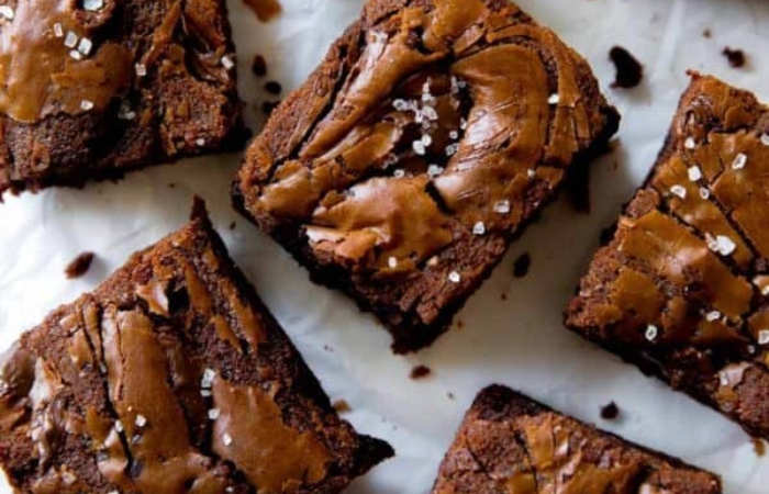 6. Despeje a massa na forma preparada e jogue colheradas do creme de avelã restante sobre ela. Com um garfo, espalhe suavemente o creme sobre a massa e polvilhe alguns grãos do sal grosso.