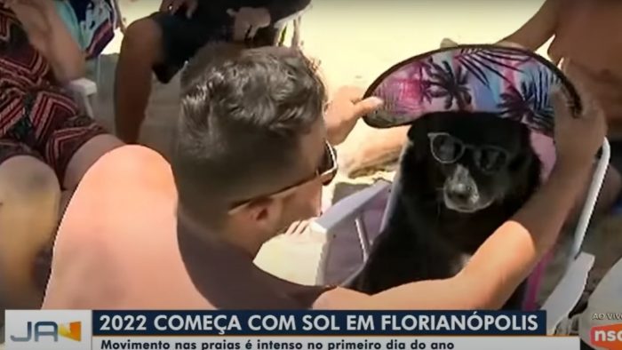 Aparentemente tranquila, a pet estava com óculos escuros, chapéu e sentada em uma cadeira de praia durante a transmissão ao vivo feita pelo repórter, na praia de Canasvieiras, em Florianópolis