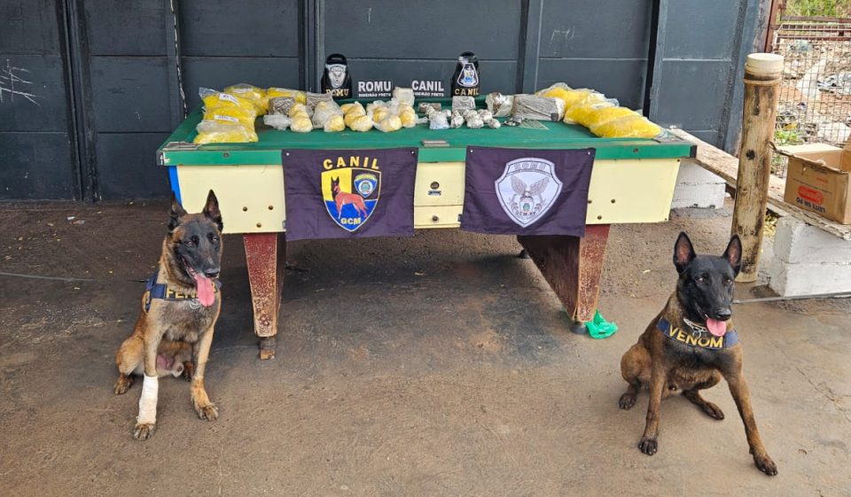 Contudo, como sabem que na região funciona uma “biqueira” de venda de drogas, utilizaram os K-9 Venon e Fenrir para fazer uma varredura. Os cães localizaram dois tambores de PVC com uma grande quantidade de drogas.