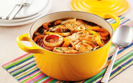 Leve ao fogo, deixe fritar levemente e adicione os pedaços de pirarucu com um pouco de água e as batatas.
