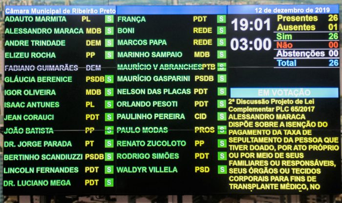 A Câmara de Ribeirão Preto aprovou, na sessão desta quinta-feira, 12 de dezembro, por unanimidade – 26 votos a favor – e em segunda votação, a redação final do projeto de Alessandro Maraca (MDB) que tem o objetivo de oferecer serviços funerários gratuitos ao doador de órgãos para transplantes. Apesar da aprovação, para sair do papel a medida precisa da sanção do prefeito Duarte Nogueira Júnior (PSDB), que pode alegar inconstitucionalidade e barrar a ideia.