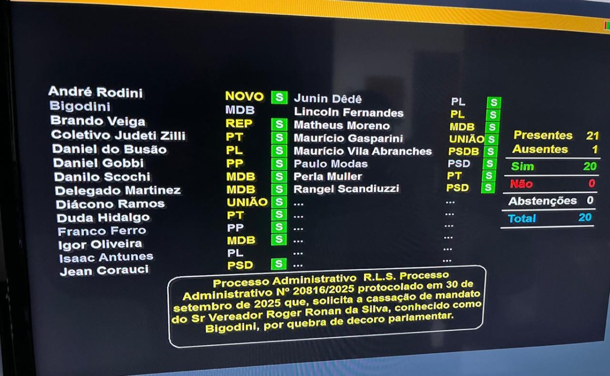 Apenas o presidente da Câmara não votou por só ser obrigado a fazê-lo em caso de empate. Bigodini está de licença médica por crise ansiedade e foi o único a não participar da sessão. O pedido de cassação foi protocolado na terça-feira, 30 de setembro, e como determina o Regimento foi lido e votado na primeira sessão subsequente a data do protocolo.