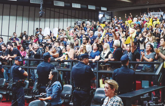 A votação do projeto nº 134/2019, que autoriza a prefeitura de Ribeirão Preto a fechar parcerias com Organizações Sociais (OS’s) e terceiriza parte da educação infantil municipal, foi marcada por protestos de professores, servidores, conselheiros e entidades ligadas à área, nesta segunda-feira, 22 de julho. Até ovos foram atirados do plenário em direção aos legisladores, mas os manifestantes não acertaram o alvo. Com cartazes e apitos e fazendo muito barulho, a plateia reclamou bastante do resultado favorável ao governo.