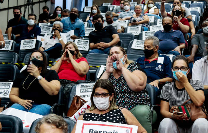 Cerca de 90 servidores ocuparam 40% do plenário da Câmara com faixas e cartazes. A sessão foi marcada por gritos de protesto e vaias. As normas básicas previstas na alteração da lei são a idade mínima, a inclusão da regra de pontuação, a mudança na forma do cálculo da aposentadoria e das regras de paridade e integralidade e nas normas de concessão de aposentadoria especial.