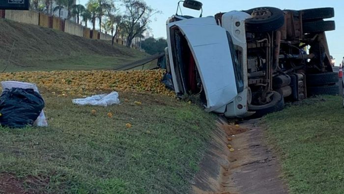 Um caminhão carregado com 27 mil kg de laranjas tombou na noite desta quinta-feira (11) no acostamento da rodovia Prefeito Antônio Duarte Nogueira (Anel Viário Sul) em Ribeirão Preto. A carga continua “depositada” no canteiro e parte dela foi saqueada na manhã desta sexta-feira (12).