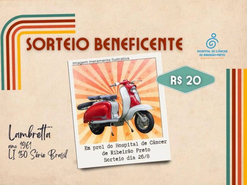 O Hospital de Câncer de Ribeirão Preto está realizando um sorteio beneficente a fim de arrecadar fundos para a instituição. O prêmio será uma Lambretta, da cor vermelha, fabricada no ano de 1961.