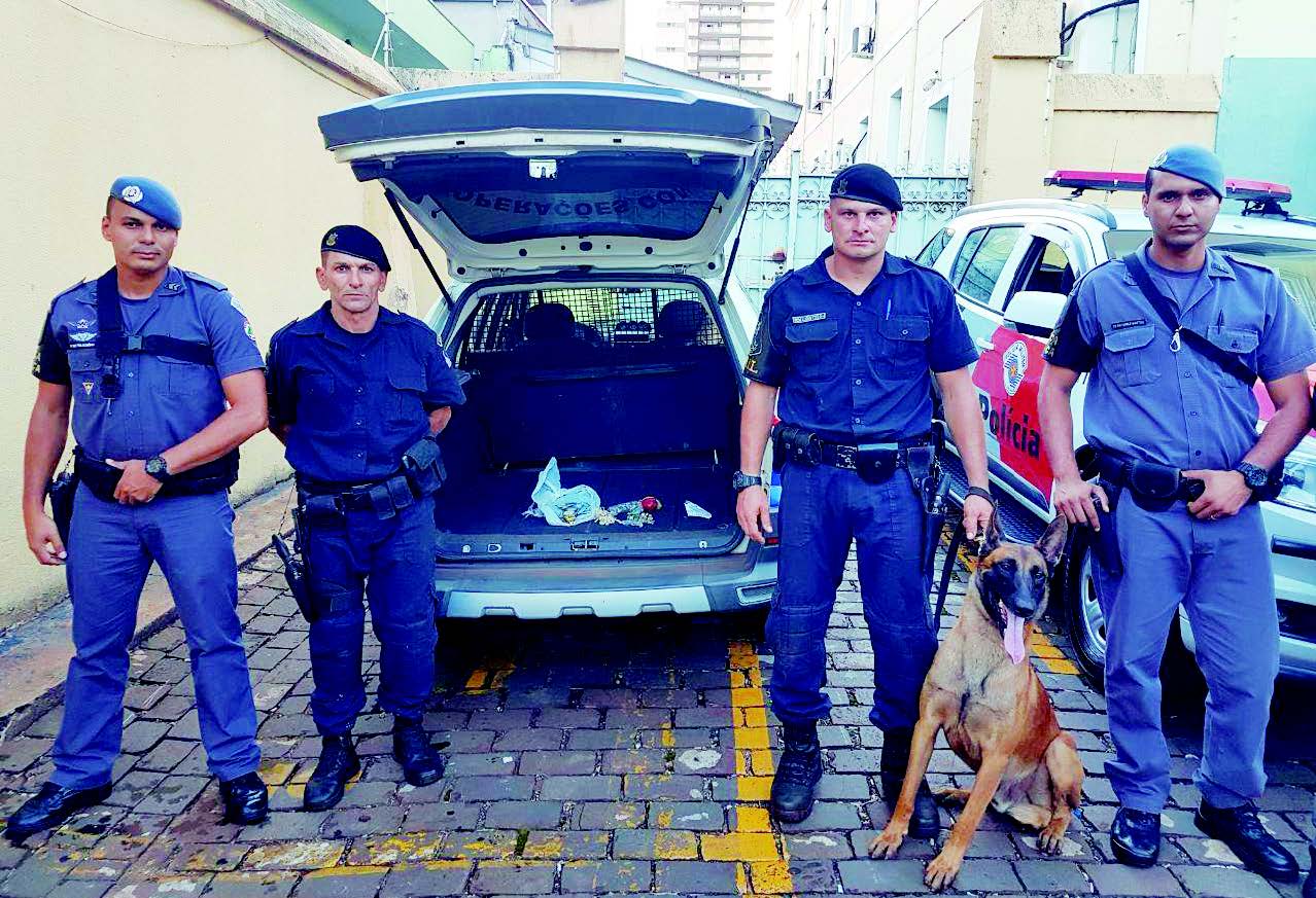 Em patrulhamento pela região da praça Francisco Schmidt, pró­ximo à Unidade Básica Distrital de Sáude (UBDS) Central, a equipe de Força Tática composta pelo sargen­to PM Almério e pelos cabos Nilton e Danilo Martins, abordou um indi­víduo suspeito. A Guarda Civil Mu­nicipal (GCM), em apoio à opeação, conseguiu localizar o material ilícito escondido com o trabalho do cão farejador Índio, um pastor belga malinois de dois anos de idade.
