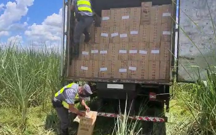 Um caminhão carregado com caixas de cigarro contrabandeadas do Paraguai foi apreendido, nesta quarta-feira (10), na Rodovia Armando Salles de Oliveira, no distrito de Marcondésia, em Monte Azul Paulista — a cerca de 130 km de Ribeirão Preto.