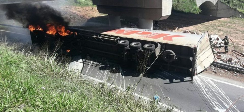 Carreta com cosméticos tomba e pega fogo na Rodovia Anhanguera, em Jundiaí (SP)