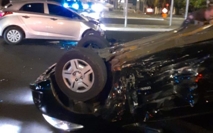 Um carro capotou na noite do domingo, 13 de junho, após um acidente de trânsito que ocorreu entre dois automóveis no cruzamento das avenidas Portugal e Antônio Diederichsen, no Jardim América, na zona Sul de Ribeirão Preto.