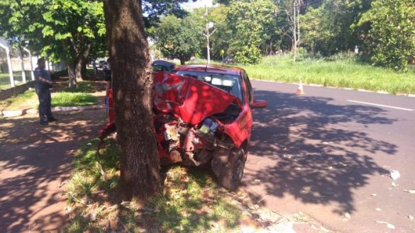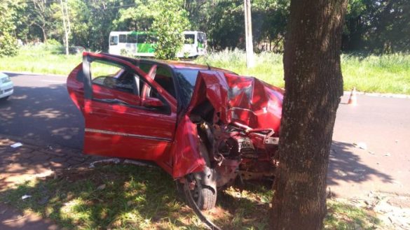 O motorista de aplicativo UBER, que dirigia um Fiat Siena e trabalha também como segurança, perdeu o controle da direção e colidiu, violentamente, com uma árvore. Ele tem 22 anos.