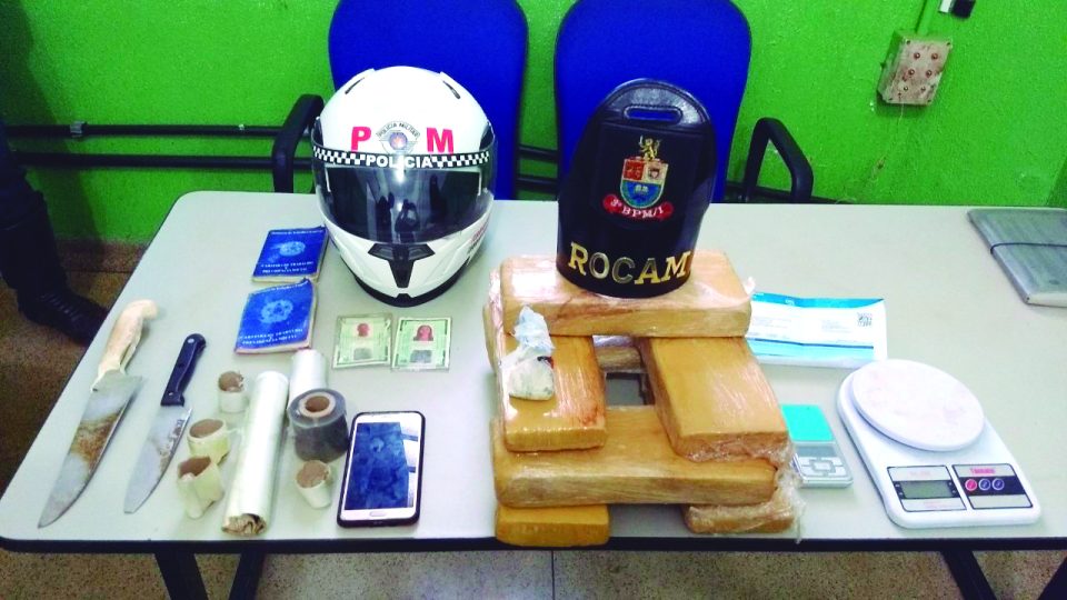 PM apreendeu 5,7 quilos de maconha, três gramas de crack, balanças de precisão e material usado para embalar a droga: moto (detalhe) e carro também foram apreendidos