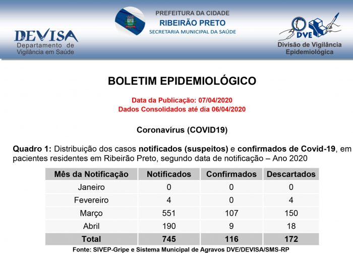 De acordo com o Boletim Epidemiológico da Secretaria da Saúde de Ribeirão Preto divulgado na tarde desta terça-feira (7), agora já são 116 casos confirmados (positivos) de coronavírus na cidade. Ontem eram 110 casos. Ribeirão também confirmou mais duas mortes, chegando agora a quatro óbitos por covid-19.