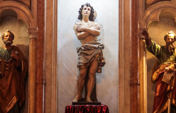 O seu corpo foi jogado no esgoto de Roma, de onde a piedosa Santa Luciana o retirou, para sepultá-lo dignamente nas catacumbas. Poste­riormente, em 680 d.C., os restos mortais foram transportados para a Basílica de São Paulo Fora dos Muros, construída pelo imperador Constanti­no. São Sebastião é representado pela imagem do momento de seu martírio, amarrado a uma árvore e atravessado por flechas. Ele é o protetor da humanidade contra a fome, as guerras e as epide­mias e padroeiro de diversas cidades brasileiras, inclusive do Rio de Janeiro.
