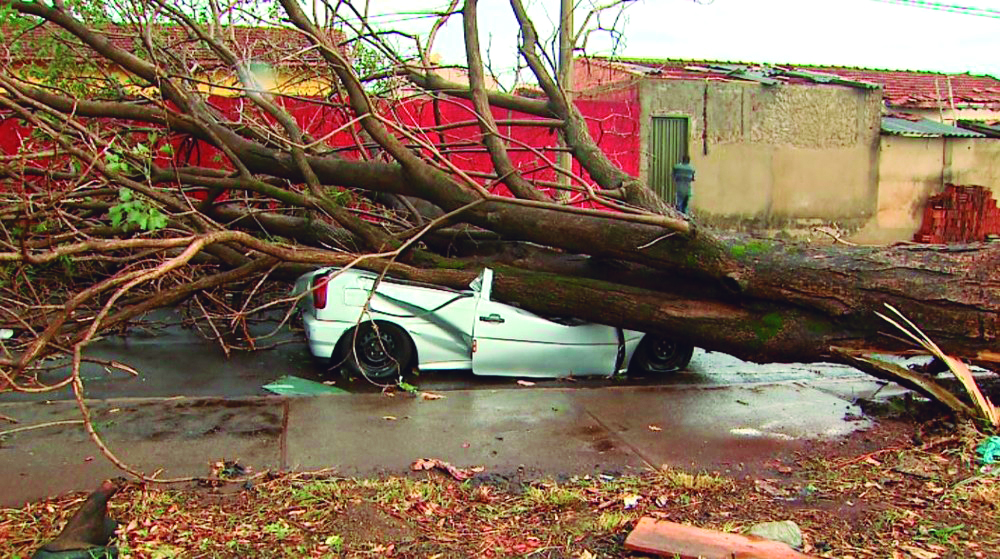 Árvore caiu sobre carro estacionado na rua Antônio Paccagnella: telhas e placas de uma empresa no Distrito Empresarial também foram arrancadas