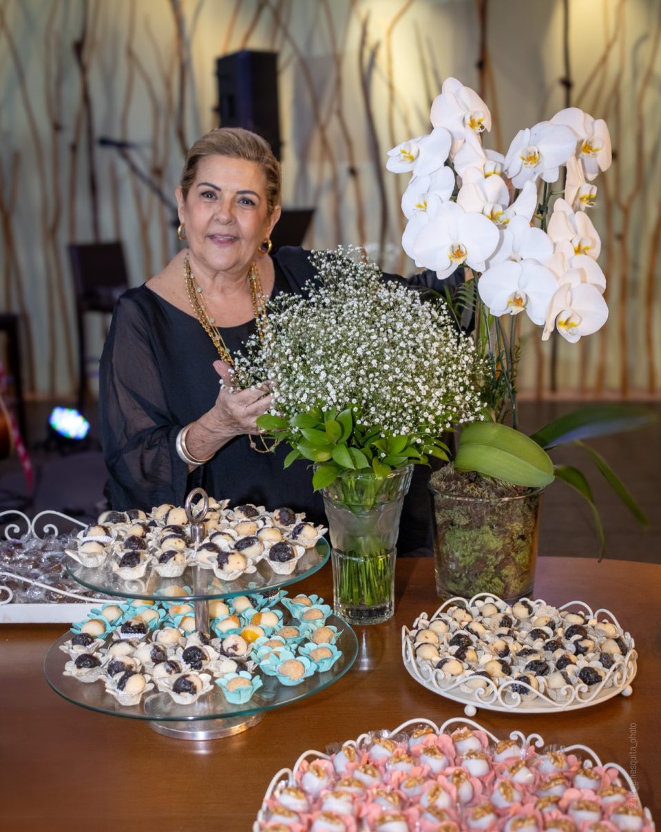 A decoração em orquídeas brancas e mosquitinhos teve os toques e retoques da Floricultura Floral.