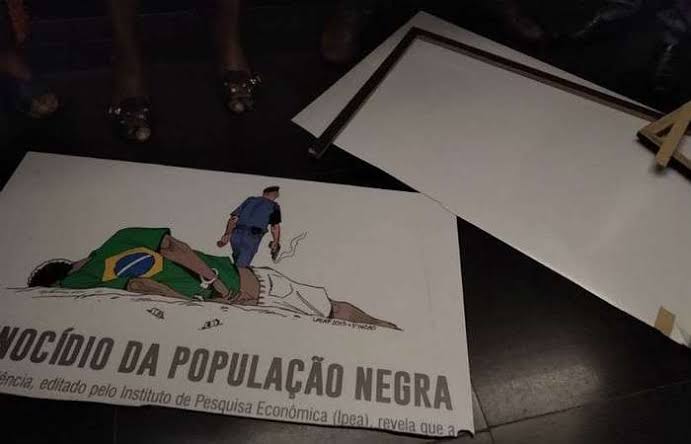 A placa traz uma charge do cartunista Carlos Latuff, em que aparece um policial, com uma arma fumegante na mão, e um rapaz negro estendido no chão, algemado e com a camisa do Brasil. No cartaz, lê-se a frase “o genocídio da população negra”.