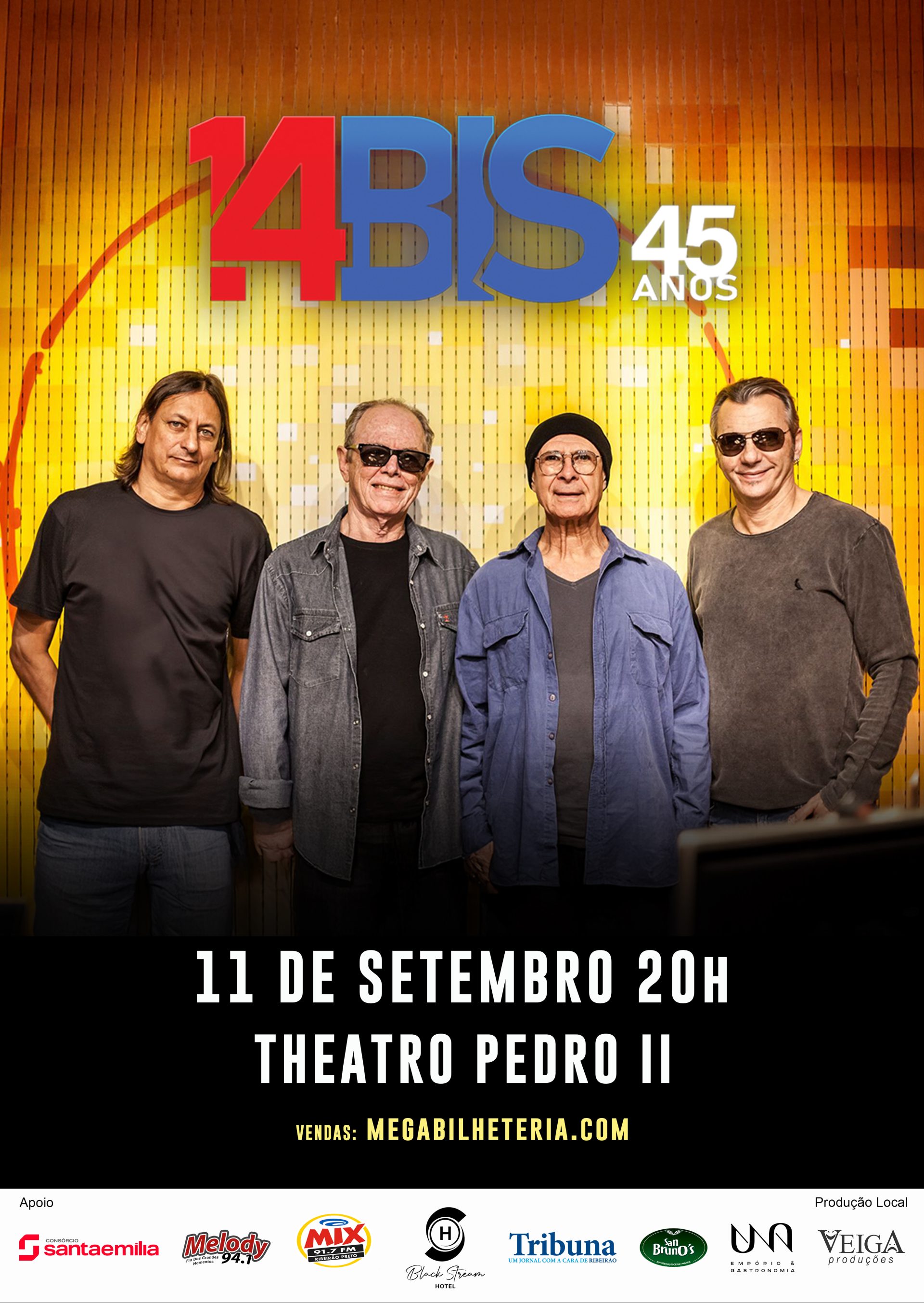 A banda icônica 14 BIS se apresenta nesta quinta-feira (11), no Theatro Pedro II, em Ribeirão Preto com um show comemorativo aos 45 anos de carreira. A apresentação acontece a partir das 20h.