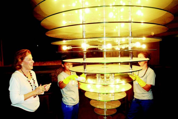As apresentações do Theatro Pedro II voltam no próximo domingo, 3 de fevereiro, com o espetáculo “Queen Experience In Concert”. Para a abertura da temporada, o espaço cultural, uma dos principais patrimônios materiais de Ribeirão Preto, recebe em janeiro os serviços de limpeza, manutenção e reparos de todo o prédio. A principal operação começou na manhã desta segunda-feira (28) com a limpeza do lustre de cristal “Gota D’Água”, da artista nipo-brasileira Tomie Ohtake, instalado na cúpula do teatro. A limpeza deve durar mais dois dias – até a tarde de quarta-feira (30). A obra de arte tem 2,70 metros e altura por 2,20 de largura, pesa cerca de 1,4 tonelada, tem 26 lâminas de vidro e mais de 80 lâmpadas especiais – todas estão sendo trocadas. Desenhado pela artista Tomie Ohtake, o lustre de cristal “Gota D’Água” é coberto por uma cúpula de gesso estrutural, com a fixação de lâmpadas especiais que fazem suas luzes passar por entre os recortes, criando um efeito escultural único. O teatro fica na rua Álvares Cabral nº 370, no Quarteirão Paulista, Centro Histórico de Ribeirão Preto. Por ser uma obra de arte importante para o teatro, todo o cuidado é pouco para a preservação do lustre, desde a retirada do lustre, sua limpeza, troca de lâmpadas e restauros necessários até ser içado novamente ao teto. Para Mariana Jábali, presidente da Fundação Dom Pedro II, a descida do lustre é um ritual muito esperado e encerra os trabalhos de limpeza do espaço. Descer a estrutura de mais de uma tonelada do teto ao chão costumava ser trabalho para seis funcionários. Eles movimentavam o objeto com ajuda de cabos de aço. Em 2014 a Fundação Dom Pedro II investiu R$ 40 mil em uma talha elétrica para “baixar” o lustre. “Antigamente, a descida do lustre era feita de forma manual, um ato muito simbólico, pois envolvia o esforço de muitas pessoas, e hoje é feito de forma elétrica. É uma emoção poder lembrar da Tomie Ohtake vindo aqui, fazendo essa intervenção maravilhosa, com a responsabilidade de misturar o antigo e o moderno, isso é muita história”, disse Mariana Jábali. O Pedro II é tombado como Patrimônio Cultural pelo Conselho de Defesa do Patrimônio Histórico Artístico, Arqueológico e Turístico do Estado de São Paulo (Condephaat) – vinculado à Secretaria de Estado da Cultura. Vai completar 90 anos em 8 de outubro de 2020. É um dos principais do Brasil, o terceiro maior de ópera do país. Foi construído entre 1928 e 1930 a pedido do advogado João Alves Meira Júnior, um dos fundadores da Cia. Cervejaria Paulista. O projeto foi elaborado pelo arquiteto Hippolyto Gustavo Pujol Júnior, e a parte estrutural da construção coube à empresa alemã Kemmitz. Em 15 de julho de 1980, um incêndio destruiu a cobertura, o forro do palco e grande parte do interior, incluindo- se o teto. A reconstrução só teve início mais de dez anos depois, em 1991, liderada pela construtora Jábali Aude. A reinauguração aconteceu em 1996.