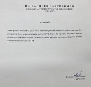 O atleta contraiu COVID cerca de um mês atrás e por conta da infecção teve um quadro de miocardite, já tratada pelo médico Jacques Bartolomeo.
