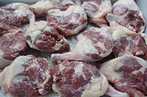 Lá também é comum encontrar gordura de pato e ganso para vender. Por aqui, além de difícil o custo é alto demais. O normal é usar banha de porco, que pode ser reutilizada para o preparo de mais Confit. (Aos poucos, ela vai ganhando a consistência e o sabor da própria gordura do pato).