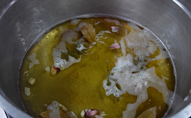 Depois de derreter metade da banha em uma panela, coloque todos os temperos.