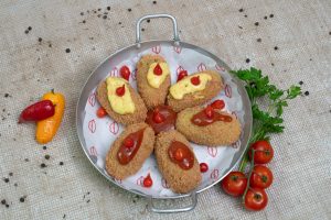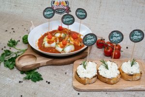 Trouxinhas de abobrinha recheadas com pernil e finalizadas com pimenta biquinho. Acompanha torradas com patê de ricota.