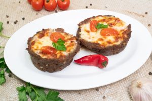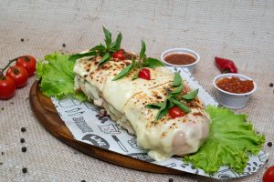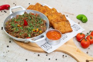 Torta de carne recheada com queijo mussarela, requeijão, parmesão e calabresa. Acompanha molho de pimenta com mel.