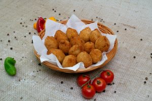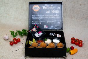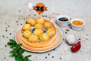 Bolinho de bacalhau do Porto com massa de cabotiá recheada com queijo mussarela. Acompanha molho de alho, vinagrete com pimenta e molho tártaro.