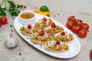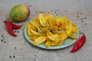 Petisco: Chips de Banana com Guacamole e vinagrete de manga