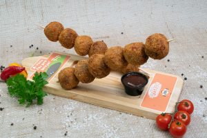 Bolinha de queijo recheado com costela. Acompanha molho de pimenta curtido na cachaça e melado de cana.