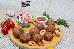 Bolinho de carne suína recheado com bacon. Acompanha molho de geleia de pimenta