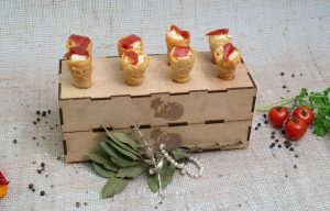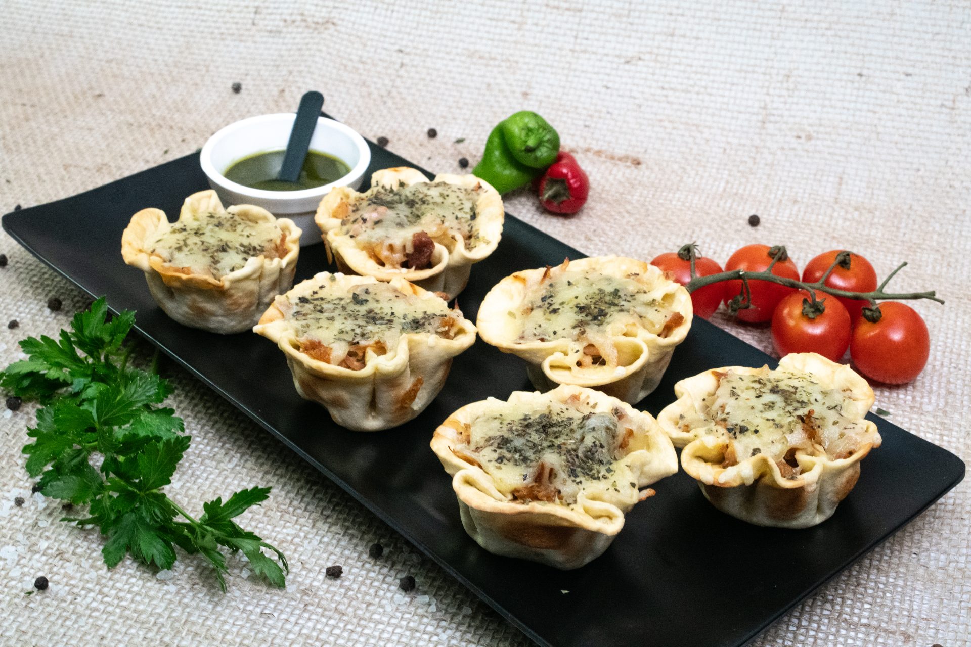 Cestinha com pernil no barbecue, acompanhado de molho pesto.