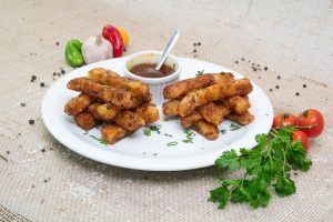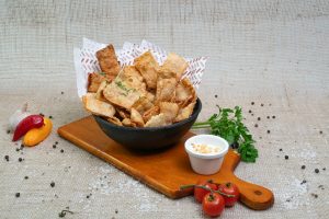 Palitos de supreme de mandioca com torresmo, queijo coalho e especiarias. Acompanha melaço de pimenta.