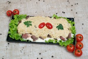 Carne bovina com molho na mostarda, acompanhado de um purê de couve flor.