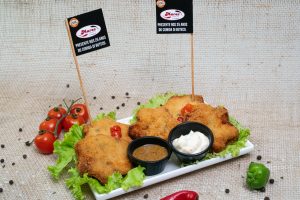Filé de Acaragel recheado com provolone, um toque de azeitona empanado e frito com um pequeno detalhe de bacon.