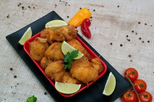 Bolinho de tilápia com massa de mandioca e recheado com queijo.