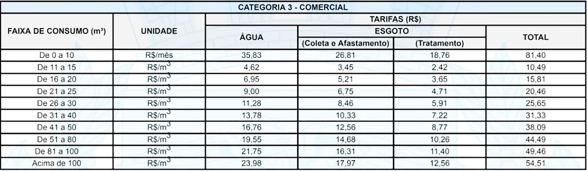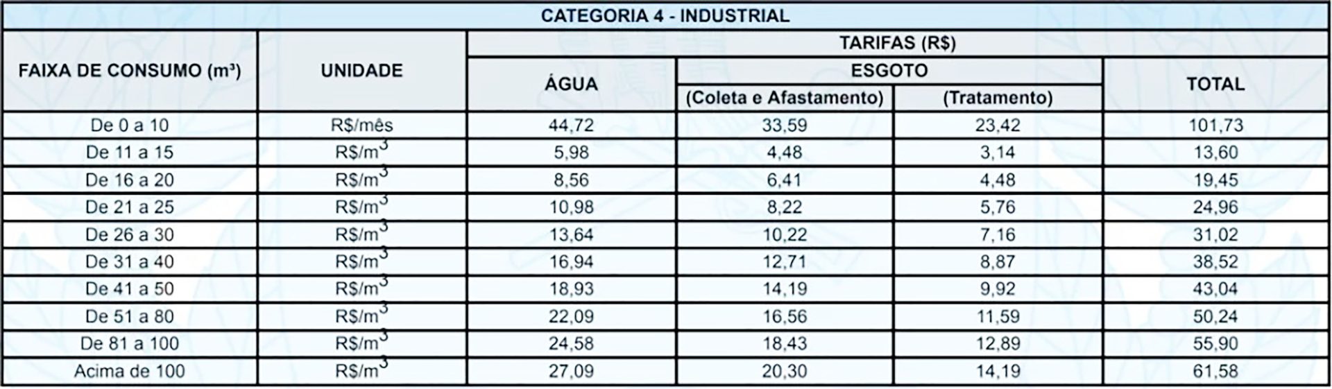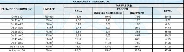 Já a tarifa mínima para um consumo de até 10 metros cúbicos por mês para o comércio será de R$ 81,40 e para indústrias de R$ 101,73. Outros serviços públicos, como fornecimento temporário de água em caminhões, o reajuste dos preços também será de 4,76%.