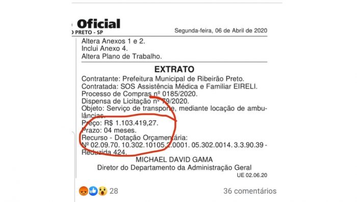 Nas redes sociais quem questiona a contratação afirma que com este valor daria para comprar nove ambulâncias do mesmo tipo que tem custo estimado de aproximadamente R$ 191 mil reais.