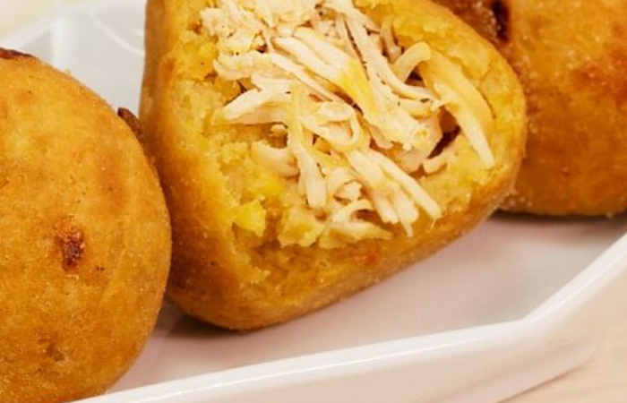 3. Divida a massa em 8 bolinhas, abra-as entre a palma das mãos e distribua o frango desfiado.