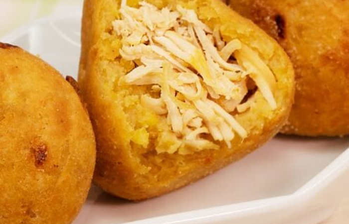 3. Divida a massa em 8 bolinhas, abra-as entre a palma das mãos e distribua o frango desfiado.