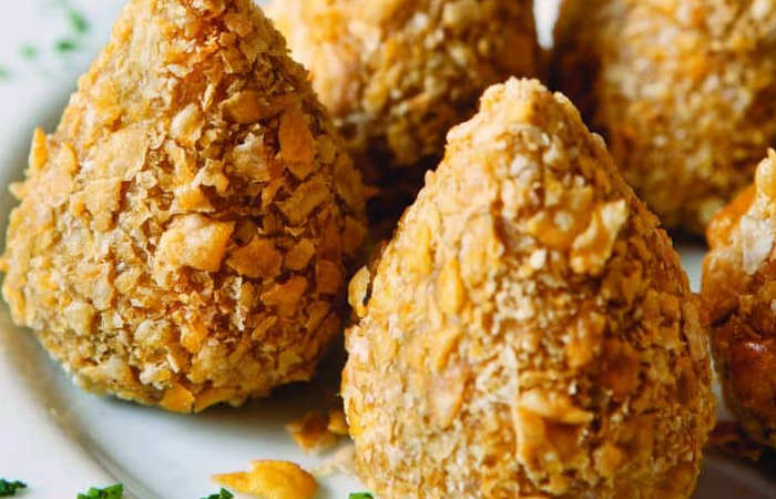7. Passe no ovo batido com o leite e o sal e, depois, nos flocos de milho.