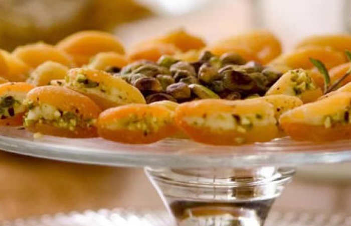 2. Misture os dois queijos, recheie os damascos e passe a parte do queijo no pistache picado.